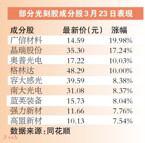 3月23日受涨价消息刺激,光刻胶板块表现强势。截至收盘,板块指数上涨4.11%。其中广信材料大涨19.98%封涨停,晶瑞股份一度涨至19.99%,收涨17.24%,奥普光电、格林达涨10%封板,南大光电、容大感光涨超8%,高盟新材、强力新材等均涨超7%。