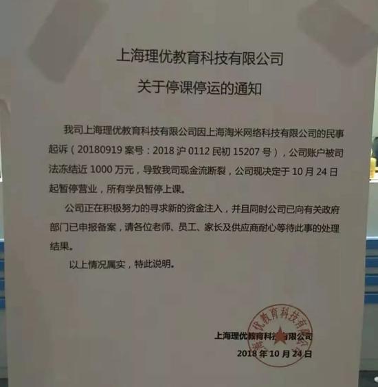 在10月22日的通知中,理优教育称,“因上海淘米网络科技公司的民事诉讼,公司账户被司法冻结近1000万元,导致资金链断裂”。